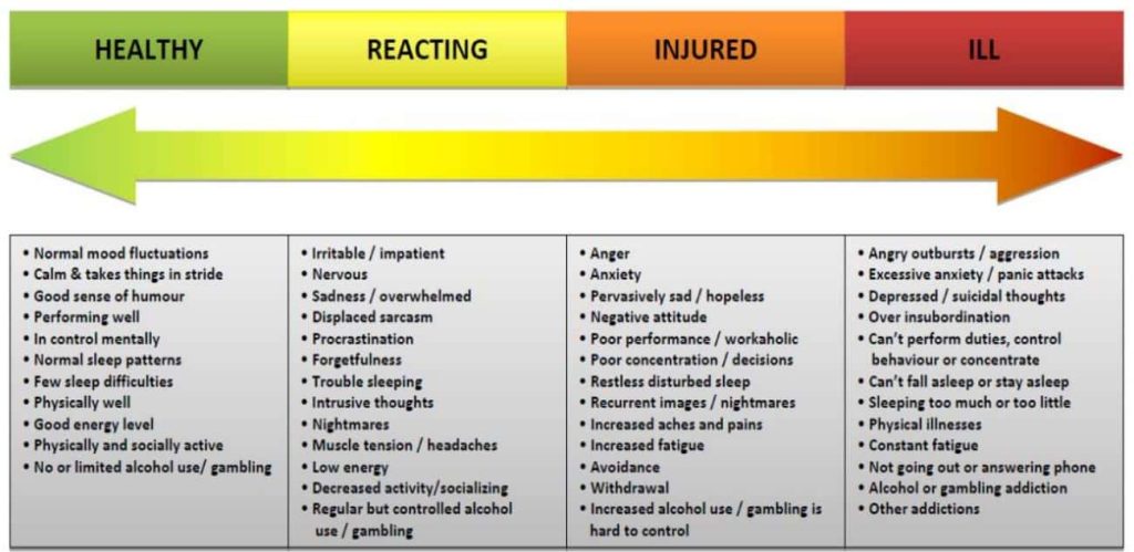This model recognizes that mental health is not black and white. The model goes from healthy, adaptive coping (green), through mild and reversible distress (yellow), to more severe, persistent injury or impairment (orange), to clinical illnesses and disorders requiring more concentrated medical care (red).