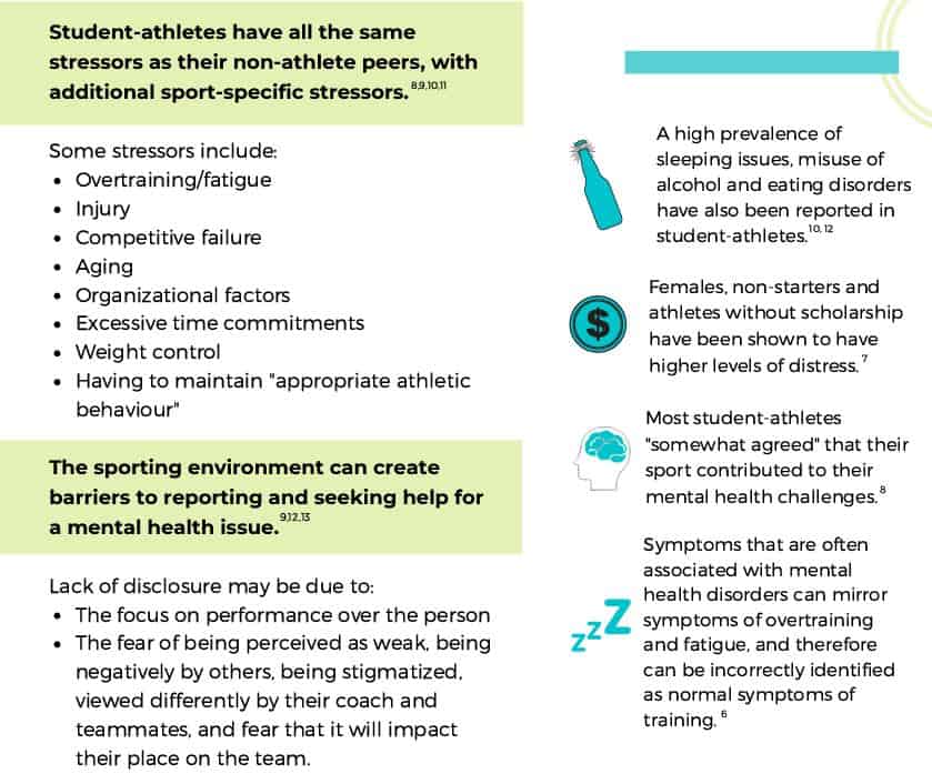 As the graphic above shows, student-athletes have been recognized as at risk of developing and struggling with mental health disorders and distress. Student-athletes are expected to balance the responsibilities of academia and athletics which creates stress. For more info visit Student Athletes Mental Health Initiative.